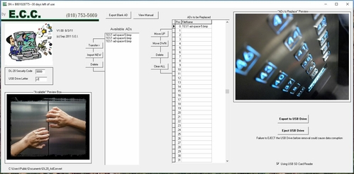 The DL-20 AD Converter is the primary software package designed for the Elevator Owner or Manager. It will convert and package the owners slide show into the proper format needed for transfer to the DL-20. Slide configuration is saved so future re-installation or changes can be made quickly and easily. Transfer is made with a simple thumb drive.